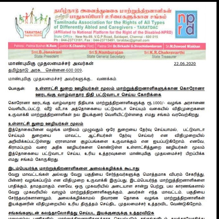 இந்த நிவாரணத்தை மாவட்ட வாரியாகப் பகுத்து வழங்கிட, அந்தந்த மாவட்ட ஆட்சியர் தலைமையில் குழு அமைக்கப்பட்டு, மாற்றுத்திறனாளிகளின் வீடுகளுக்கே சென்று, இரண்டு 500 ரூபாய் நோட்டுகளாக இந்த நிதி வழங்கப்பட வேண்டும் என மாற்றுத்திறனாளிகள் நல ஆணையர் அவர்கள் நேற்று வழிகாட்டு நெறிமுறைகளை வெளியிட்டார். இந்த வழிகாட்டு நெறிமுறைகளில் சில திருத்தங்கள் செய்யப்பட வேண்டும் என்பதை வலியுறுத்தி, அனைத்துவகை மாற்றுத்திறனாளிகள் மற்றும் பாதுகாப்போர் உரிமைகளுக்கான சங்கம் டாராடாக் முதல்வருக்கு ஒரு கடிதத்தை அனுப்பியுள்ளது. அந்தக் கடிதத்தில்,
