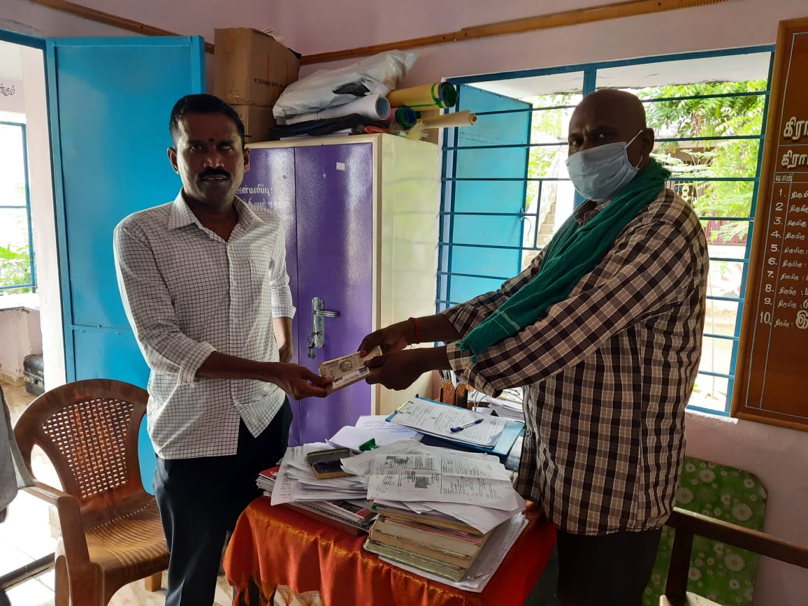 | கிராம நிர்வாக அலுவலரிடமிருந்து இரண்டு 500 ரூபாய் நோட்டுகள் பெறும் பார்வை மாற்றுத்திறனாளி |