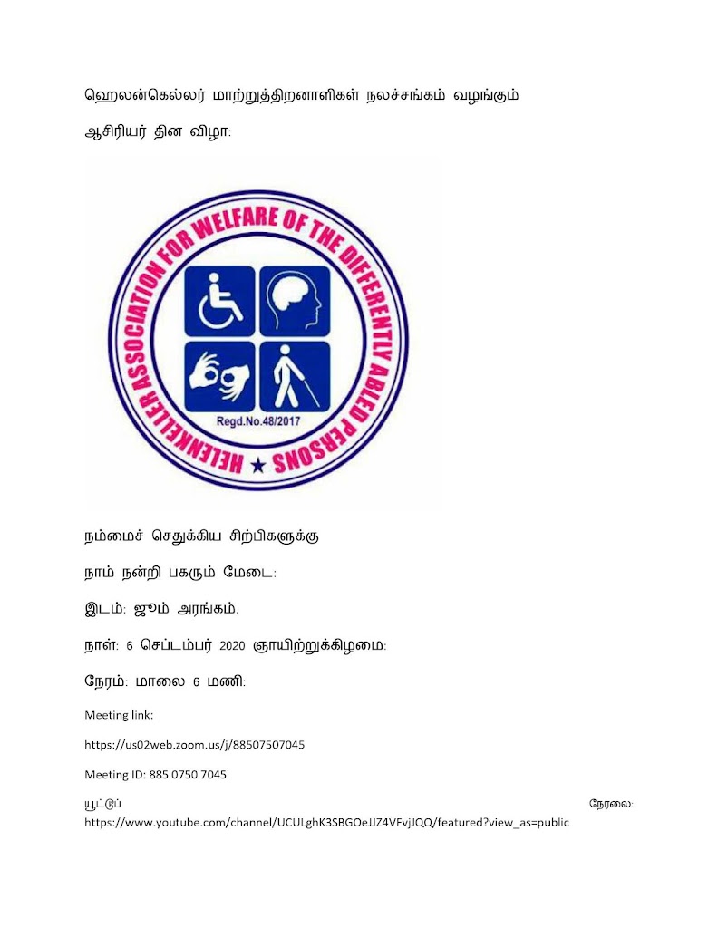 2 [செப்டம்பர், 2020 Meeting link:https://us02web.zoom.us/j/88507507045Meeting ID: 885 0750 7045 நேரம்: மாலை 5.45 மணி. யூட்டூப் நேரலை: https://www.youtube.com/channel/UCULghK3SBGOeJJZ4VFvjJQQ/featured?view_as=public இன்று: செப்டம்பர் 2 2020புதன்கிழமை: பங்கேற்கும் பள்ளிகள்: 1. இந்தியப் பார்வையற்றோர் சங்கம் (IAB) முன்னால் மாணவர்கள் மட்டும். 2. T.E.L.C. பார்வையற்றோர் பள்ளி திருப்பத்தூர் (சிவகங்கை மாவட்டம்) முன்னால் மாணவர்கள் மட்டும். 3. செயின்ட் ஜோசப் பார்வையற்றோர் பள்ளி பரவை. முன்னால் மாணவர்கள் மட்டும். 4. C.S.I. பார்வையற்றோர் பள்ளி அயர்னியபுரம் முன்னால் […]